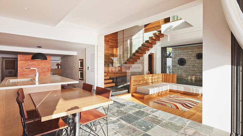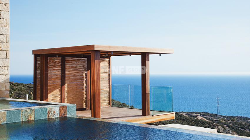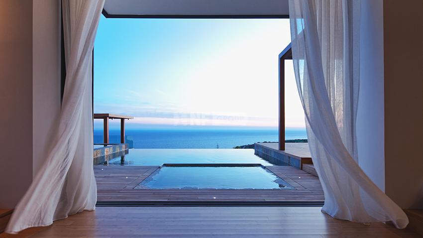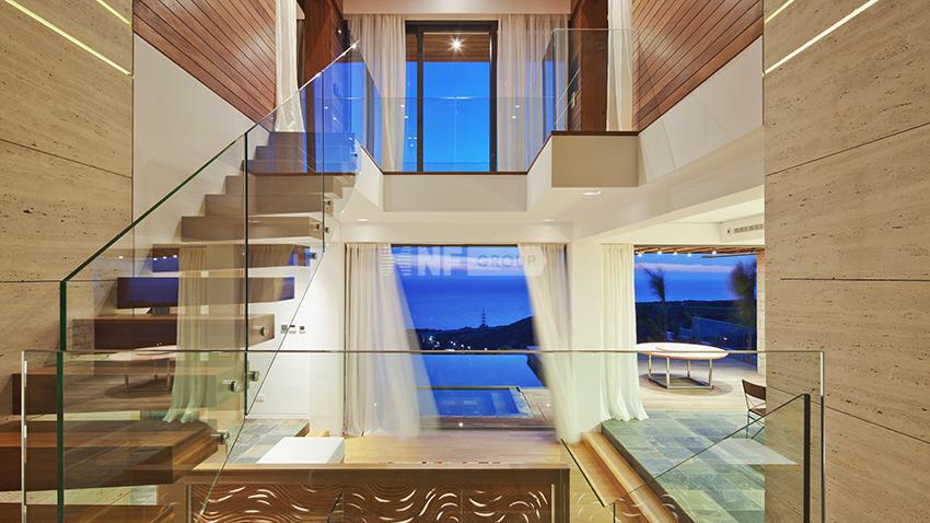 Вилла площадью 320 кв. м располагается на 3 этажах и включает 5 спален, тренажерный зал, спа-зону и лифт. На крыше виллы находится сад с частным переливным бассейном. Панорамные окна визуально расширяют внутреннее пространства и открывают панорамный вид на море.
